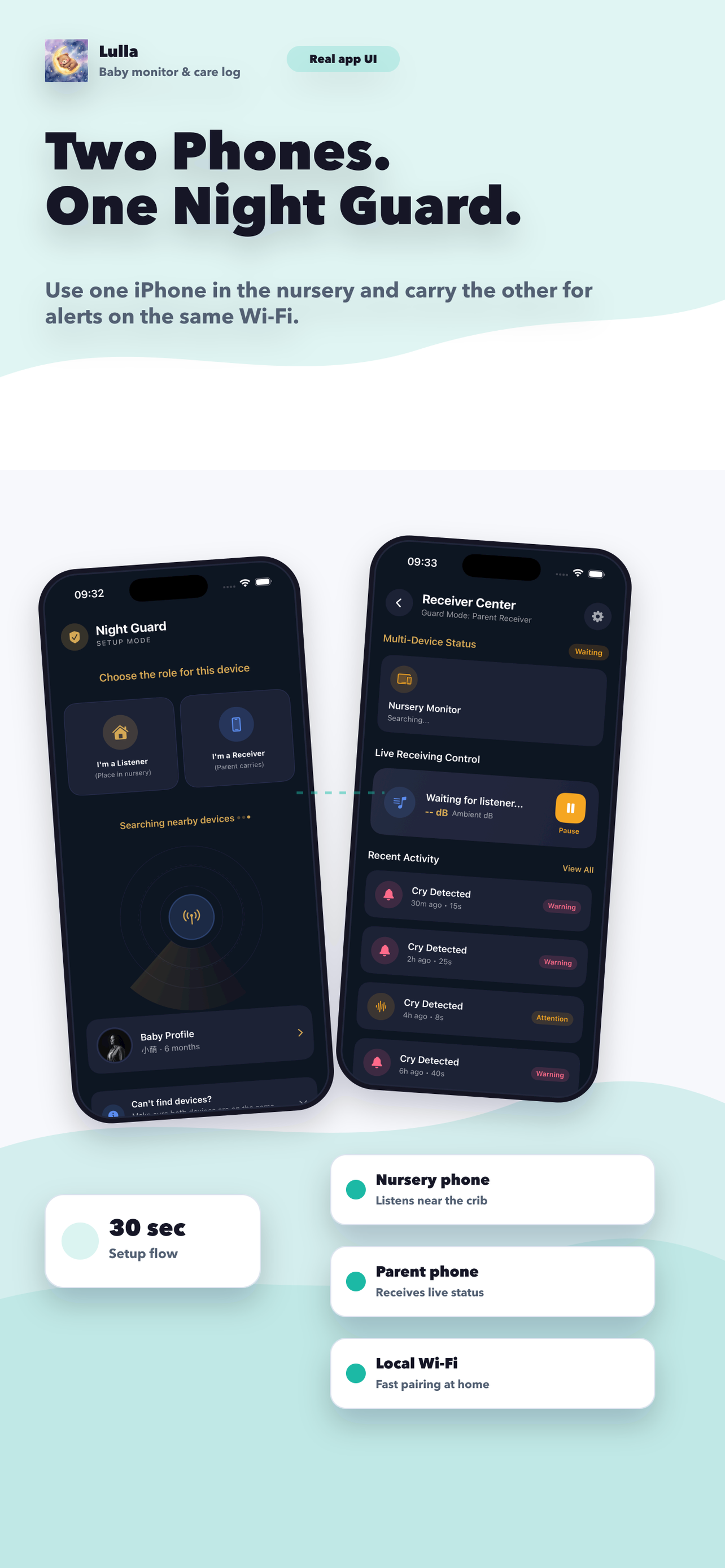| Core workflow | One iPhone listens in the nursery, one iPhone stays with the parent |